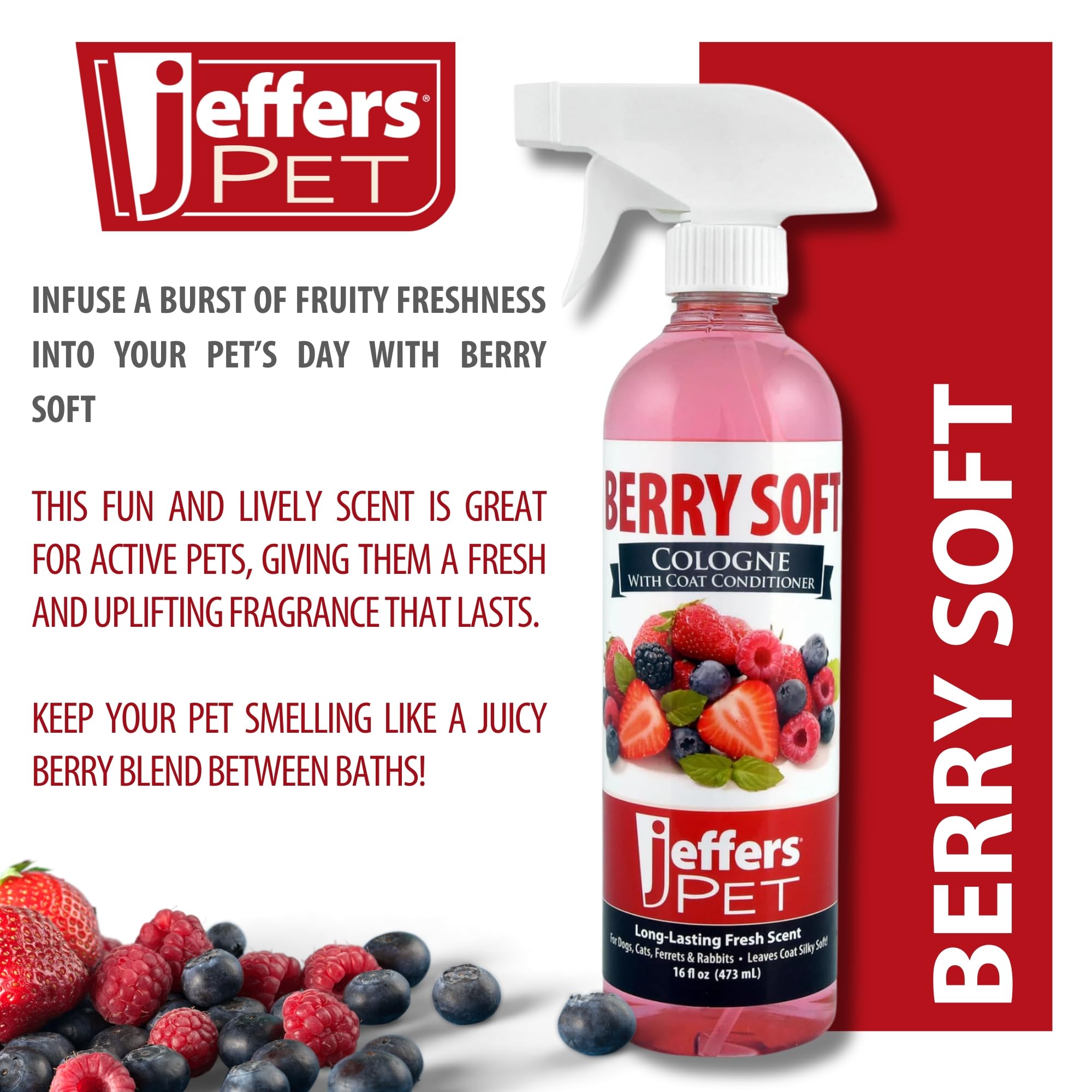 Jeffers Pet Cologne Spray with Coat Conditioner for Dogs & Cats, 16 oz - Detergent & Soap Free Grooming Fragrance Mist, Coat Deodorizer, Freshener, Safe for Pets, Salon, Home Use - Berry Soft Scent—
